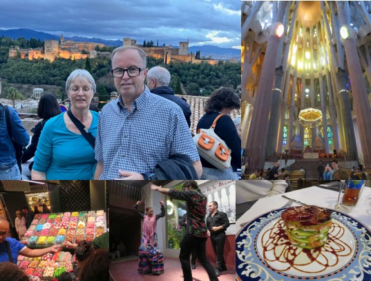 The photos to the left show some of our Adventures in Spain – clockwise from top left: Richard and Maureen in Granada at sunset, Gaudi’s modernist masterpiece in Barcelona – La Sagrada Familia, delicious Spanish cuisine, some wild Flamenco dancing and a colourful Spanish market. There are lots of fascinating stories and great pictures along with entertaining personal insights.