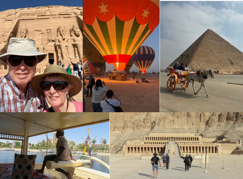 The photos to the left show some of our Adventures in Egypt – clockwise from top left: Richard and Maureen exploring the Abu Simbel temple, hot air ballooning in Luxor, the Great Pyramid of Giza, the temple of Hatshepsut (a woman who became a Pharoah) and cruising in a felucca along the Nile River. We will have many fascinating stories and great pictures along with entertaining personal insights.