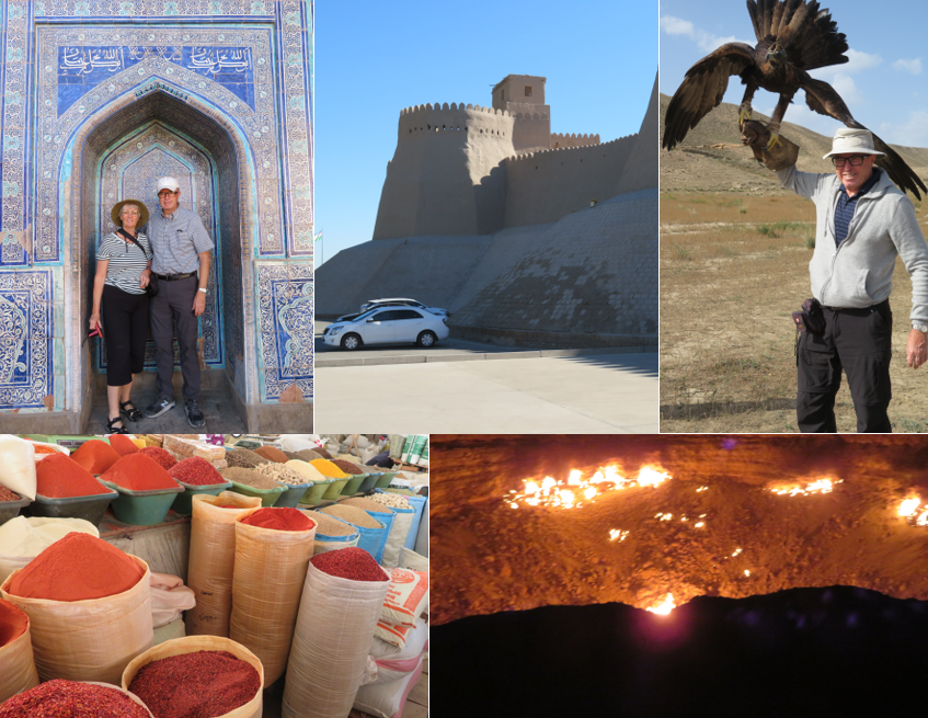 The photos to the right show some of our Adventures on the Silk Road – clockwise from top left: Richard and Maureen Jordan exploring the local Islamic architecture, the forbidding walls of the old town in Khiva, Richard holding a Golden Eagle in Kyrgyzstan where we met local men who use them for hunting, the “Door to Hell” crater at Darvaza, Turkmenistan and bags of spices at the market in Tashkent, Uzbekistan.